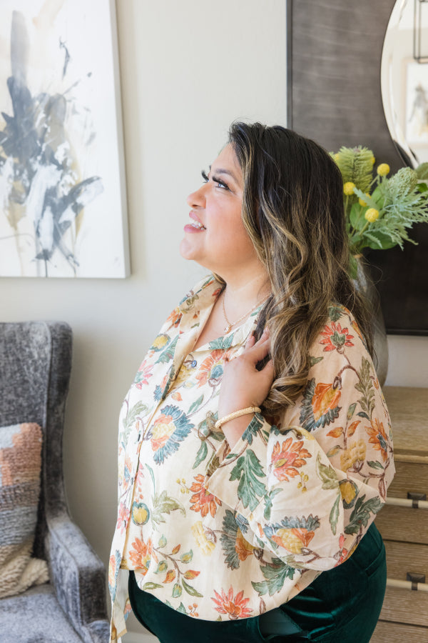 Effortlessly polished with a relaxed fit, the Autumn Sky Button Top brings easy elegance to your fall wardrobe. Featuring a subtle floral print, ¾ sleeves, and a button-down front, this lightweight top blends comfort and sophistication. The dropped shoulders and soft drape make it perfect for layering or wearing on its own — ideal for workdays, weekends, and everything in between.