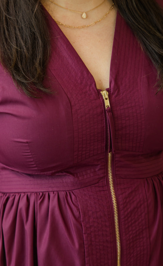 Sleek and versatile, the City Stroll Midi is designed to take you from day to night with ease. Featuring a flattering V-neckline with a zip-front closure, cap sleeves, and textured stitched banding, this midi dress offers a polished look with everyday comfort. A smocked waistband at the back ensures a flexible fit, while the side pockets add a practical touch. Lightweight, lined, and woven, it’s perfect for transitional dressing.