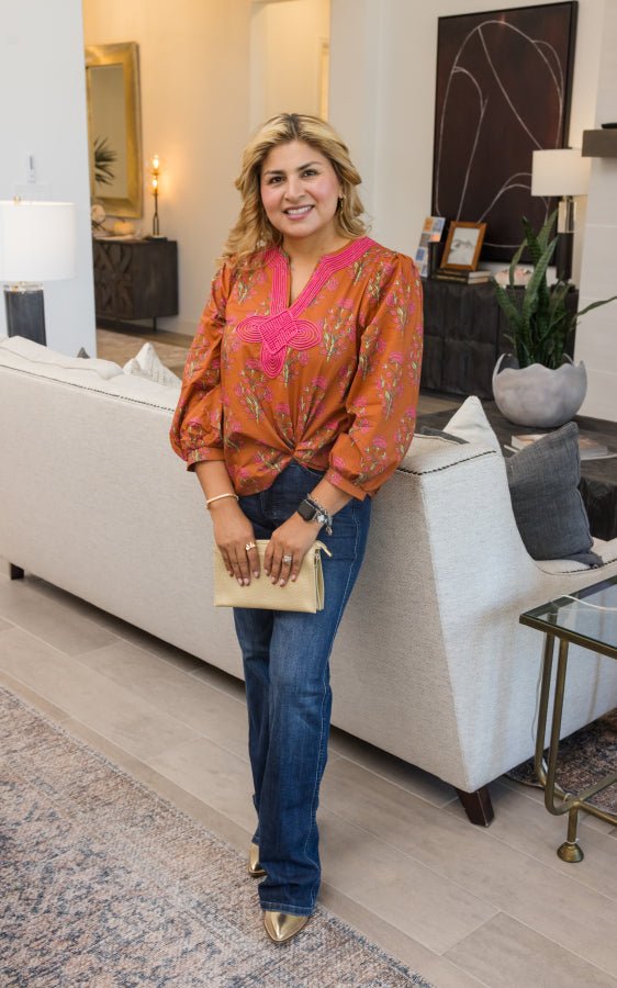Bring a touch of boho charm to your wardrobe with the Harvest Bloom Embroidered Top. This floral print blouse features long puff sleeves and a beautifully detailed embroidered knot trim along the V-neckline, adding a handcrafted touch to its effortless silhouette. Lightweight and breathable, it’s perfect for transitioning from summer to fall — pair it with your favorite denim, cords, or skirts for an instantly polished look.