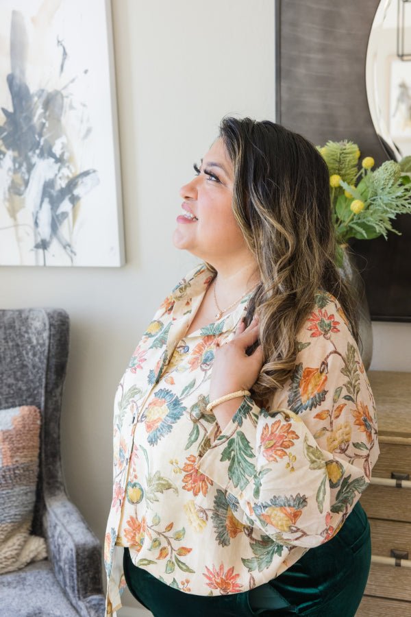 Effortlessly polished with a relaxed fit, the Autumn Sky Button Top brings easy elegance to your rodeo wardrobe. Featuring a subtle floral print, ¾ sleeves, and a button-down front, this lightweight top blends comfort and sophistication. The dropped shoulders and soft drape make it perfect for layering or wearing on its own — ideal for workdays, weekends, and everything in between.