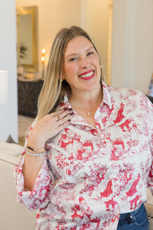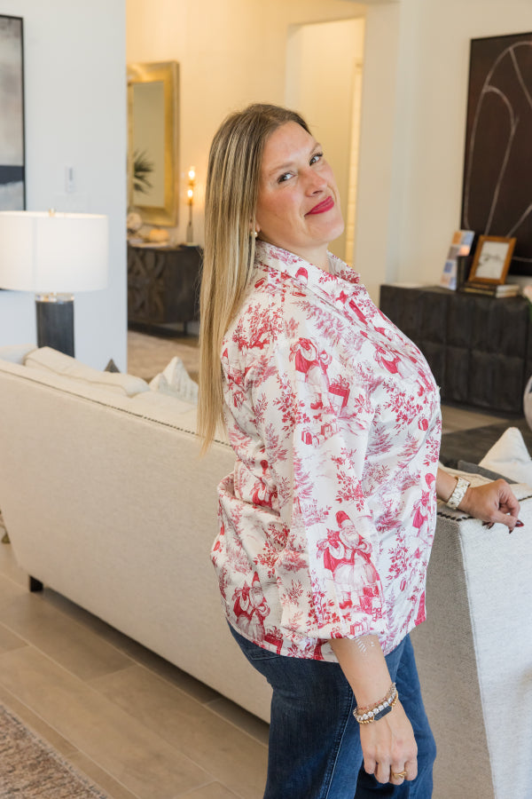 Classic, cozy, and full of holiday charm, the Vintage Santa Toile Top brings timeless style to your festive wardrobe. This red and cream quarter-sleeve top features a nostalgic toile print with vintage Santa details — perfect for Christmas gatherings, cookie baking, or cozy fireside moments. Designed with a soft, lightweight feel, it’s a merry must-have for the season!