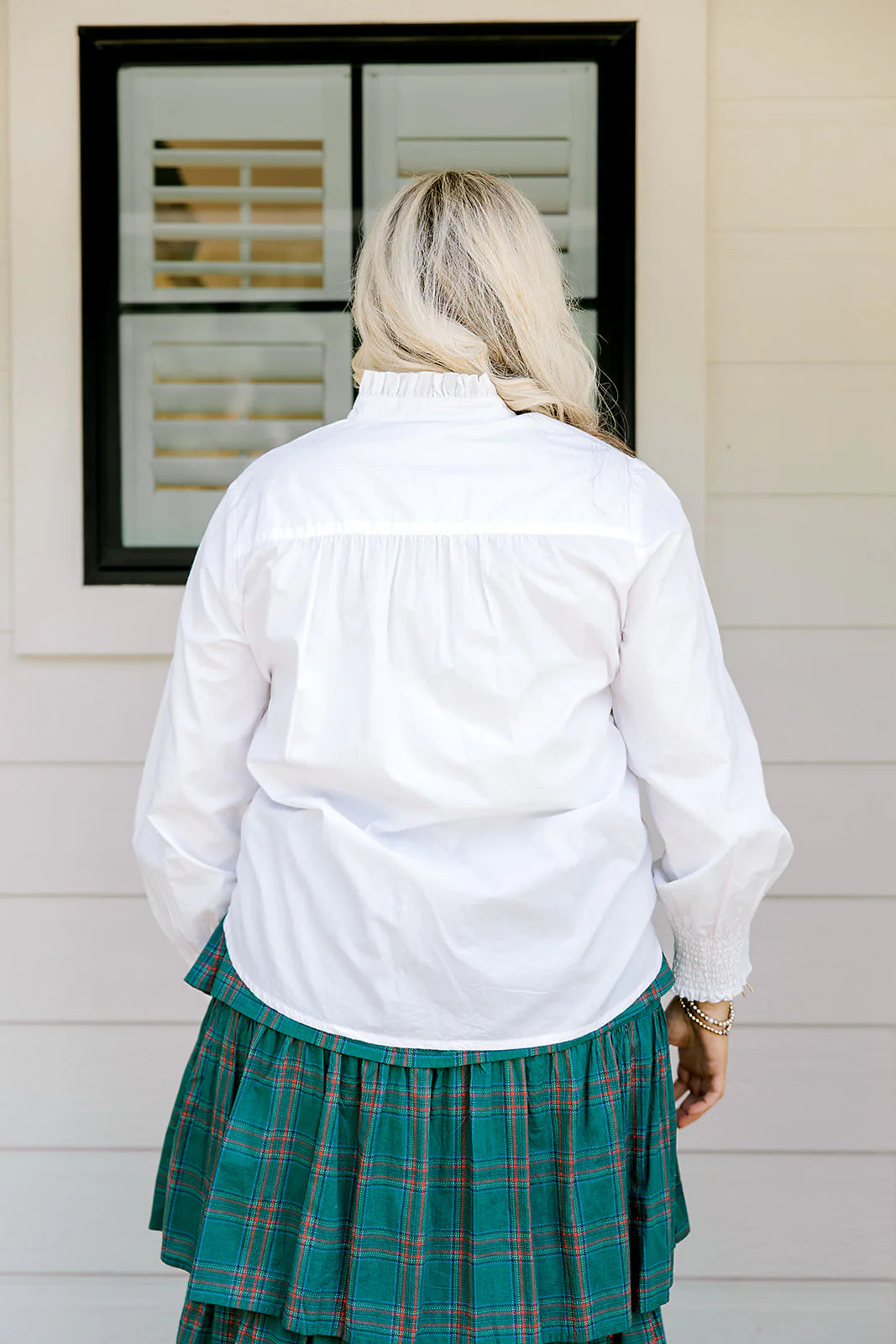 Simple, stylish, and effortlessly versatile, the Ruby Snowfall Button Top adds a subtle festive touch to your winter wardrobe. Crafted from crisp white cotton and finished with classic ruby red buttons, this long-sleeve top offers just the right pop of holiday charm. Dress it up for seasonal gatherings or pair it with denim for an elevated everyday look—either way, it’s a timeless winter staple.